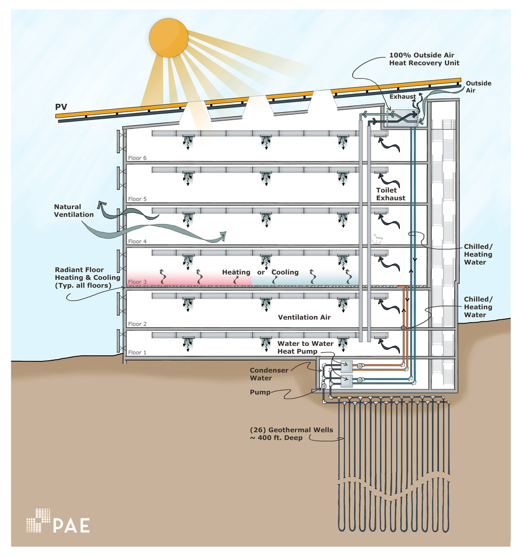 Energy performance at the Bullitt Center is the result of layered, integrated strategies. The building operates with an Energy Use Intensity (EUI) of just 10 kbtu/sf/yr, far below typical commercial standards. A 242-kilowatt rooftop photovoltaic array generates more energy than the building consumes, producing 60% more than needed in 2014. By replacing desktop computers with cloud-based servers, thin clients, and laptops, the building reduces plug load energy use by an estimated 78%. These strategies combine to deliver 83% overall energy efficiency.