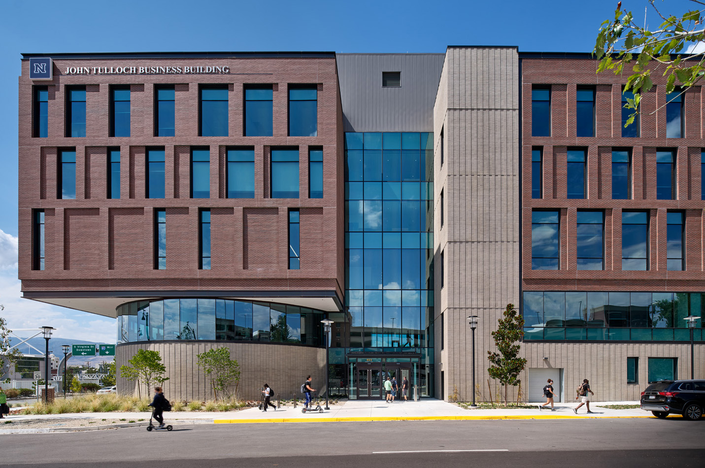 The new College of Business building spans 128,000 square feet and anchors the Mathewson University Gateway, connecting the University of Nevada campus to downtown Reno. The four-story facility includes a 300-seat auditorium, café, social and collaboration spaces, a landscaped courtyard, and outdoor plazas.
